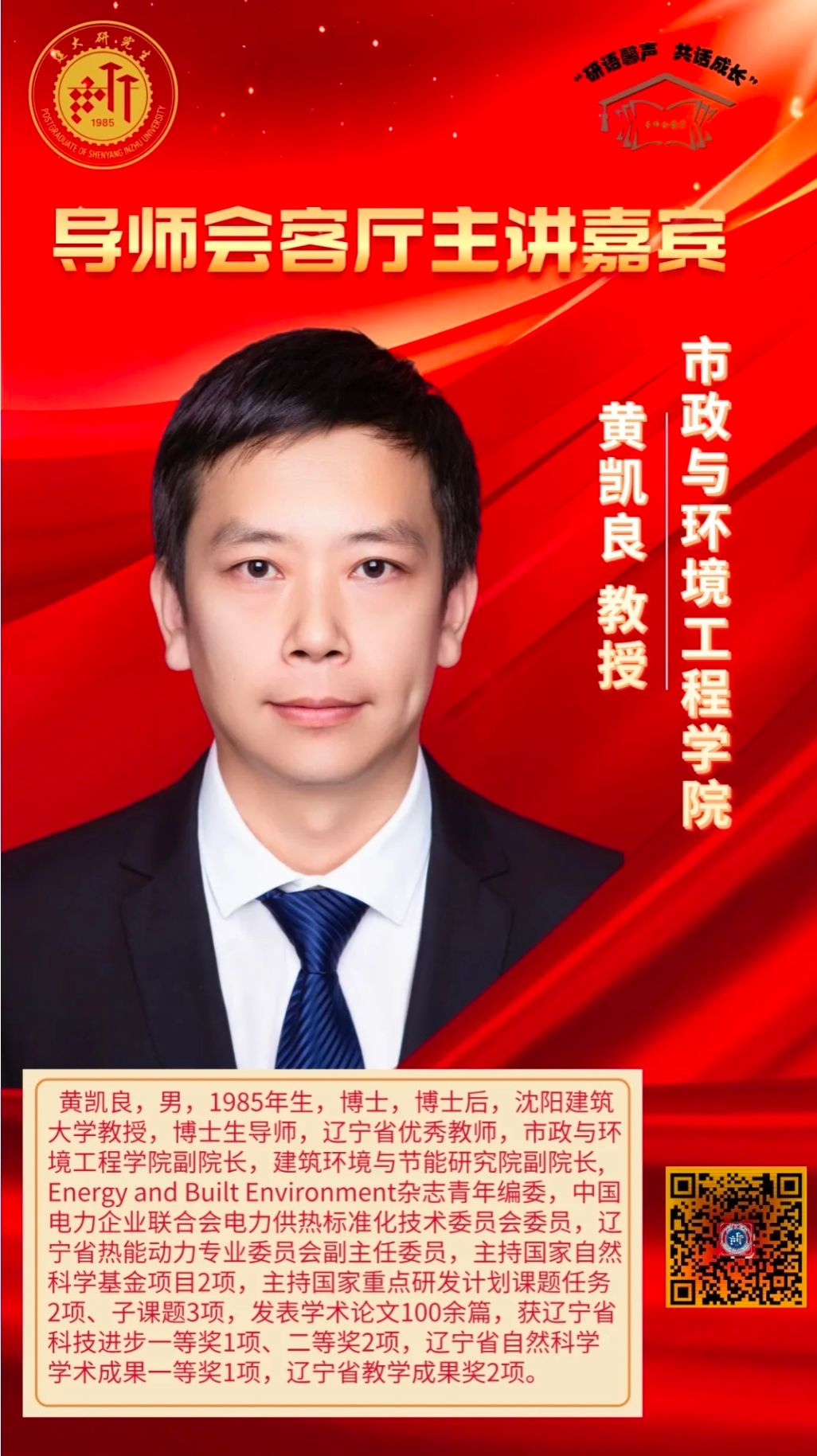 研究生院主办,市政与环境工程学院承办,校研究生会协办的导师会客厅将于12月12日 9:30在A2-405举办,本期邀请到黄凯良教授担任主讲嘉宾。